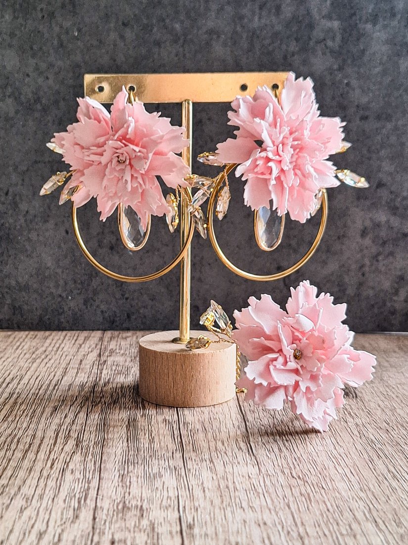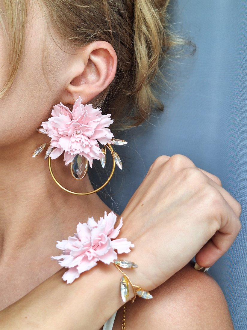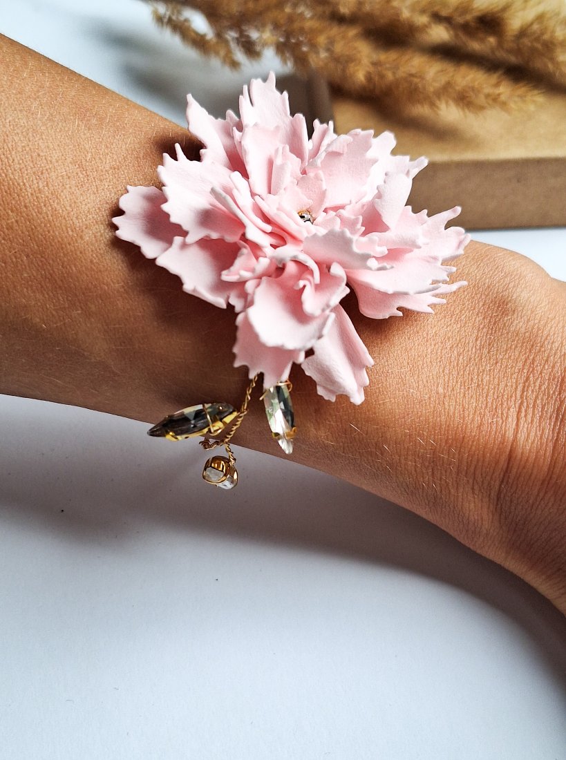 Wyjątkowa bransoletka w formie dużego, ręcznie wykonanego kwiatu goździka w pastelowym różu. Umieszczony na złotym drucie julilerskim, ozdobiony kryształkami o pięknym szlifie, tworzą spektakularny i romantyczny dodatek.