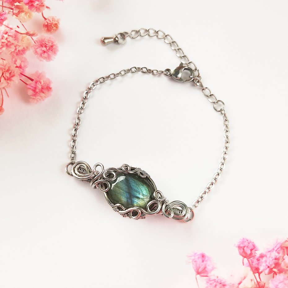 Bransoletka z Labradorytem ręcznie robiona. Wykonana techniką wire wrapping z drutów ze stali chirurgicznej.