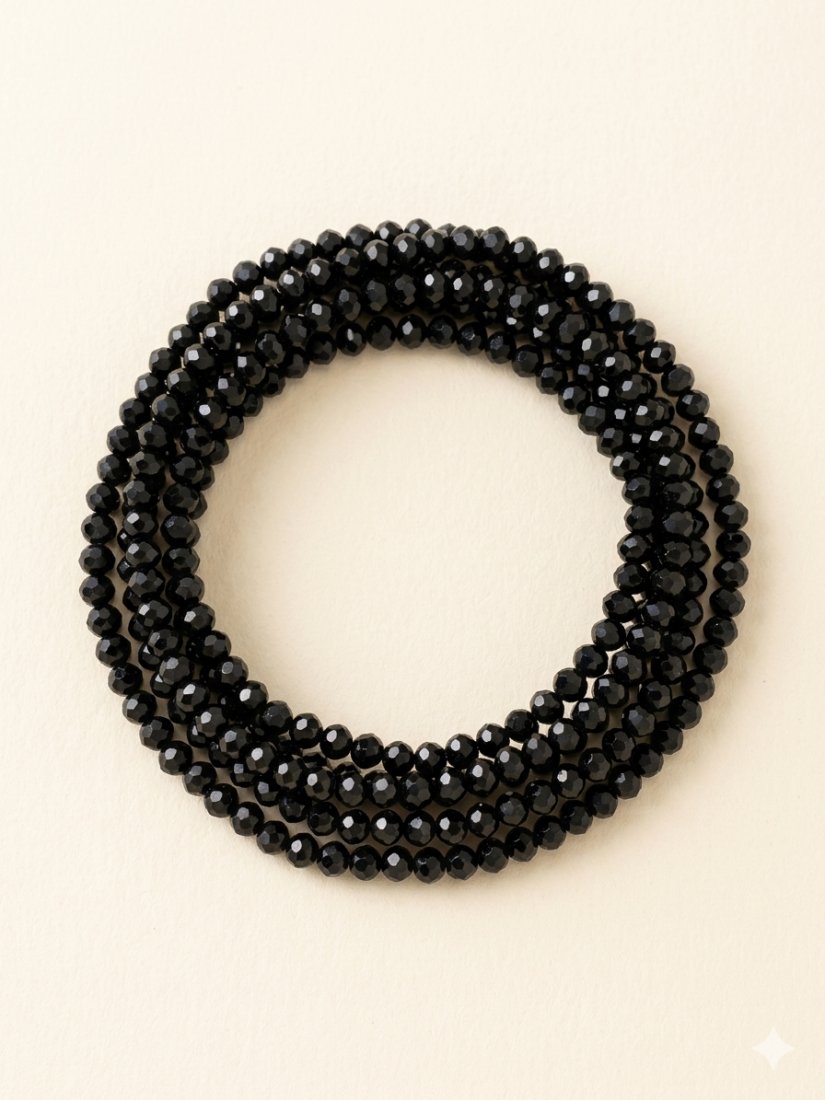 Elegancka bransoletka z czarnych, szlifowanych koralików w kolorze czarnym. Dzięki fasetowaniu kryształki efektownie odbijają światło przy każdym ruchu ręką. Bransoletka na gumce. Długi sznur można nosić na szyi.