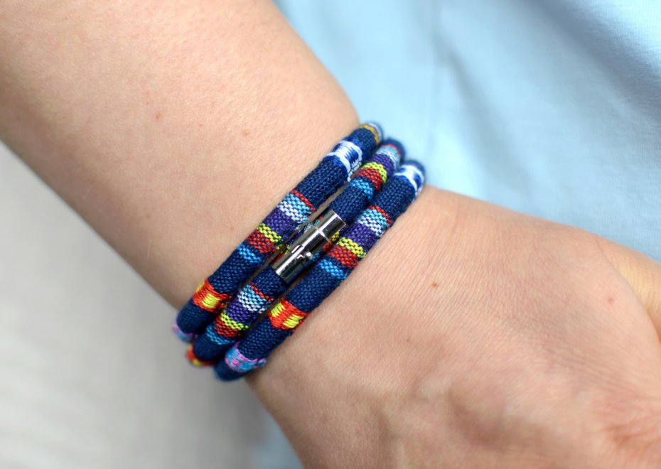 Barwna bransoletka w stylu BOHO wykonana z szytego, okrągłego rzemienia-liny z tkaniny (śr. 6mm). Posiada magnetyczne zapięcie z blokadą ze stali szlachetnej.