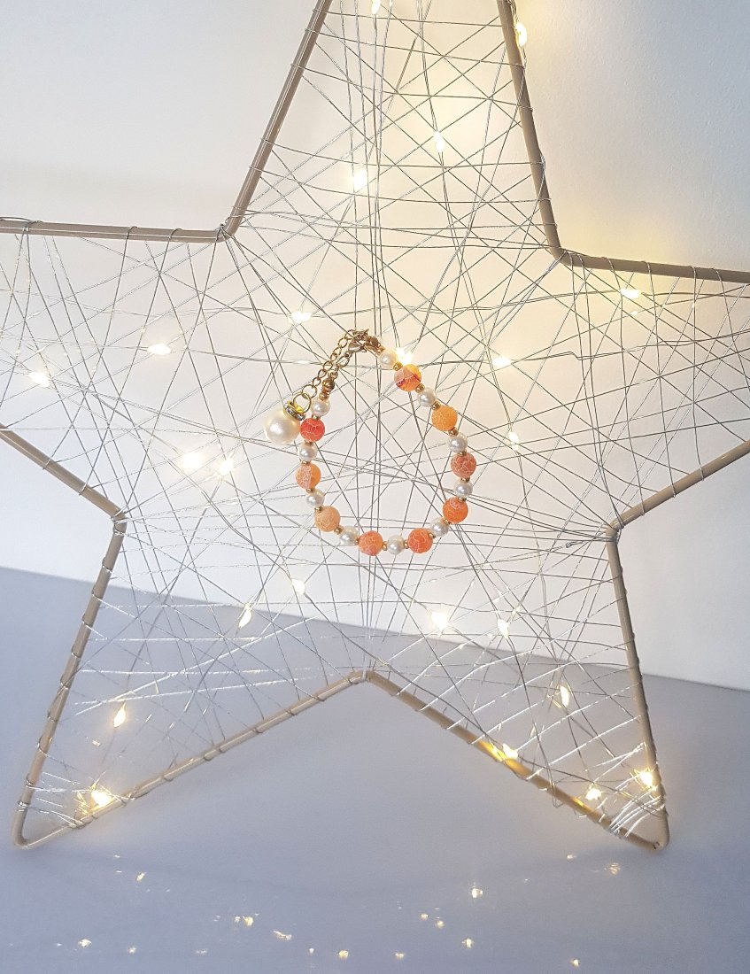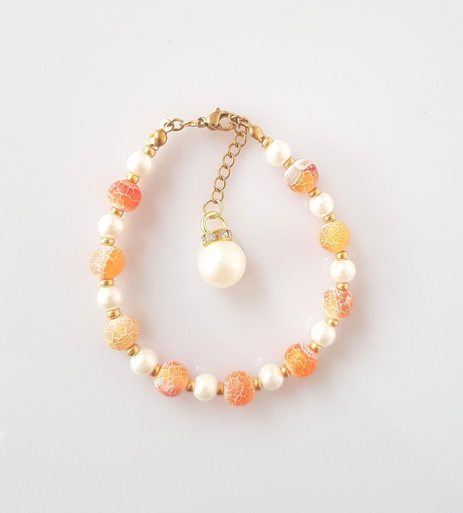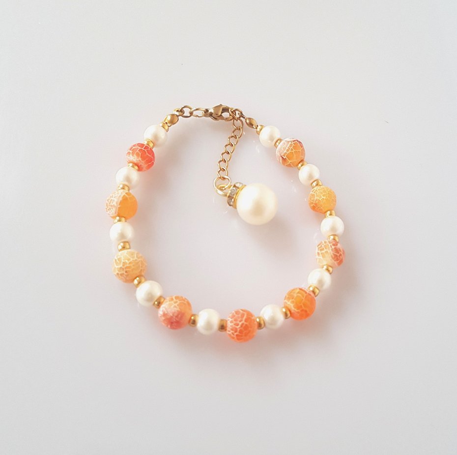 Kulki agatu trawionego w kolorze mandarynki i białe perełki muszlowe.