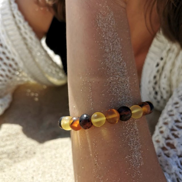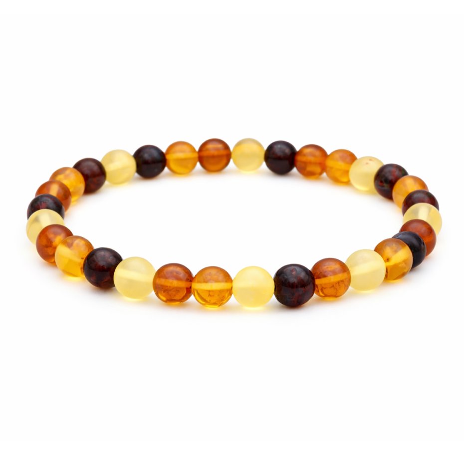 Bransoletka z kolorowego bursztynu bałtyckiego. Nieoszlifowane, okrągłe koraliki połączone elastyczną, silikonową gumką. Oferta Amber 77 obejmuje jedynie ręcznie wykonane produkty, co czyni każdy z nich niepowtarzalnym oraz unikatowym.