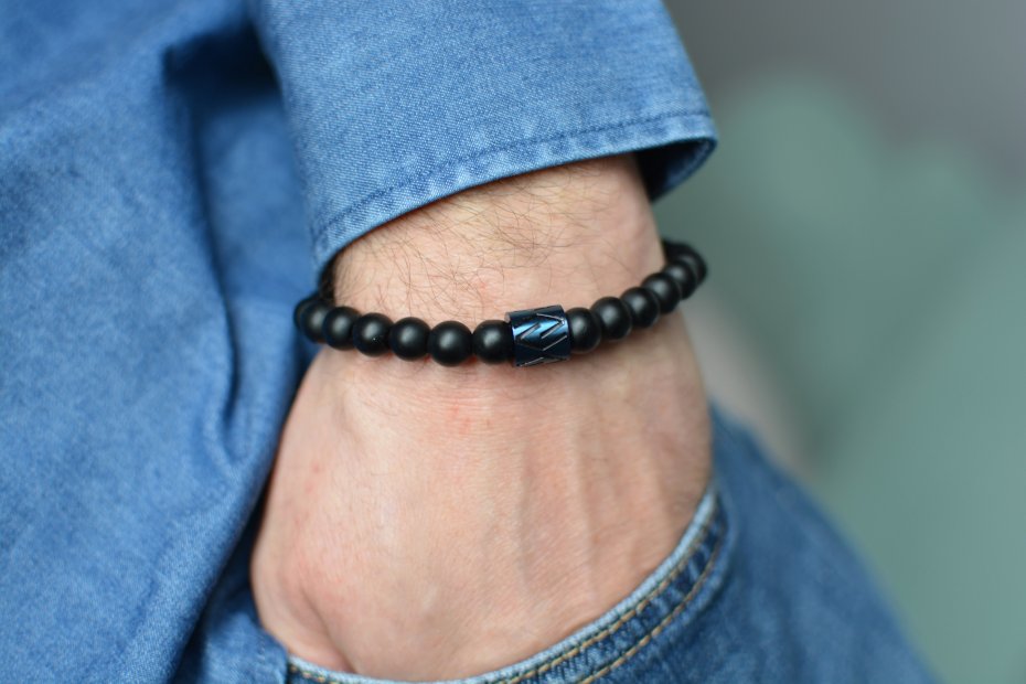 W męskim stylu, wygodna (zarówno w noszeniu jak i zakładaniu) bransoletka wykonana z matowych kulek onyksu (śr. 8 mm) nanizanych na mocną, silikonową gumkę. Dodatkową ozdobę bransoletki stanowi nowoczesny element przekładkowy ze stali szlachetnej platerowanej na kolor niebieski.