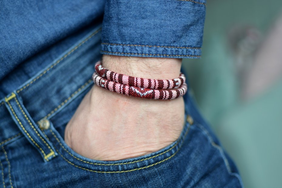 Wygodna bransoletka wykonana z okrągłego, szytego rzemienia z materiału bawełnianego o wyraźnym splocie (o śr. 6mm). Bransoletka z zapięciem magnetycznym ze stali szlachetnej satynowanej, które stanowi jednocześnie jej ozdobę.