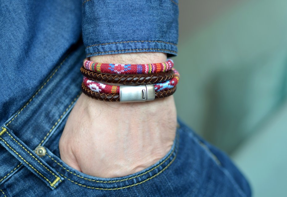 Wygodna bransoletka typu podwójny "oplataniec" o etnicznym charakterze, wykonana z dwóch rzemieni o średnicy 0,6cm: skórzanego oraz szytego materiałowego (z tkaniny o wyraźnym splocie). Bransoletka została wykończona zapięciem magnetycznym z blokadą ze stali szlachetnej satynowanej. Dzięki lekkiemu wygięciu w łuk zapięcie to bardzo ładnie układa się na nadgarstku.