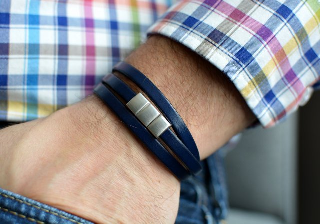 Wygodna bransoletka wykonana ze skórzanego, płaskiego rzemienia w kolorze ciemnoniebieskim (navy blue) (o szerokości 0,6cm) z zapięciem ze stali szlachetnej (satynowanej) z wbudowanym magnesem.