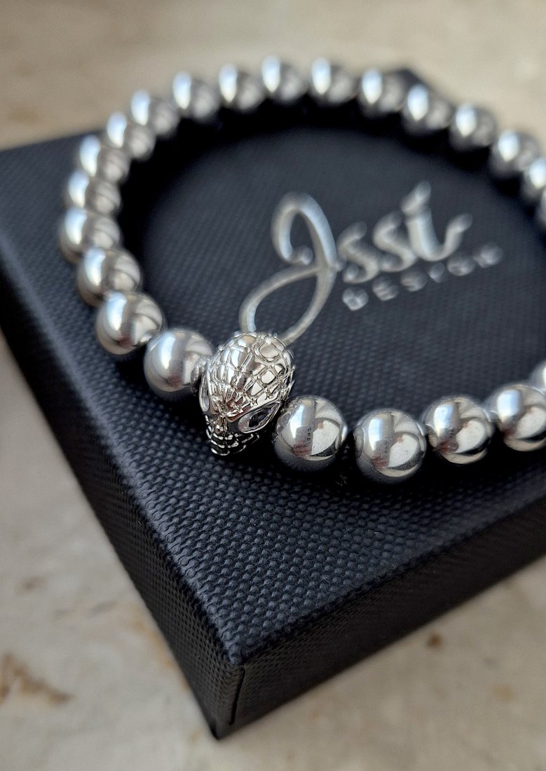 Bransoletka męska wykonana ze srebrnego hematytu oraz przekładki ozdobionej cyrkoniami Swarovski.