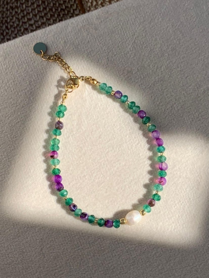 Bransoletka wykonana z purpurowych agatów oraz jadeitów w odcieniu butelkowej zieleni z zapięciem na karabińczyk.