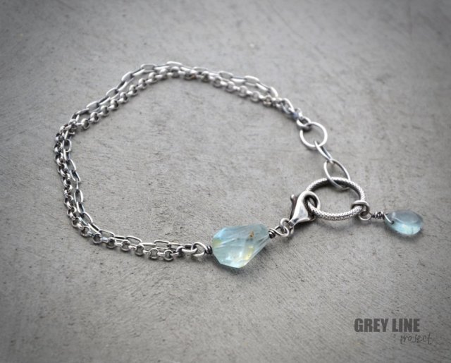 Delikatna bransoletka wykonana ze srebra próby 925, oksydowanego i polerowanego oraz bardzo ładnej bryłki i łezki błękitnego akwamarynu.