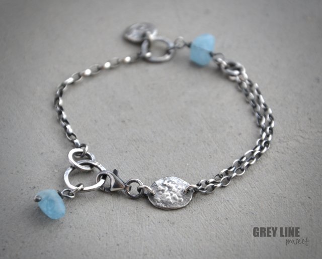 Bransoletka wykonana ze srebra próby 925, oksydowanego i przecieranego oraz naturalnego błękitnego akwamarynu (6x9mm).