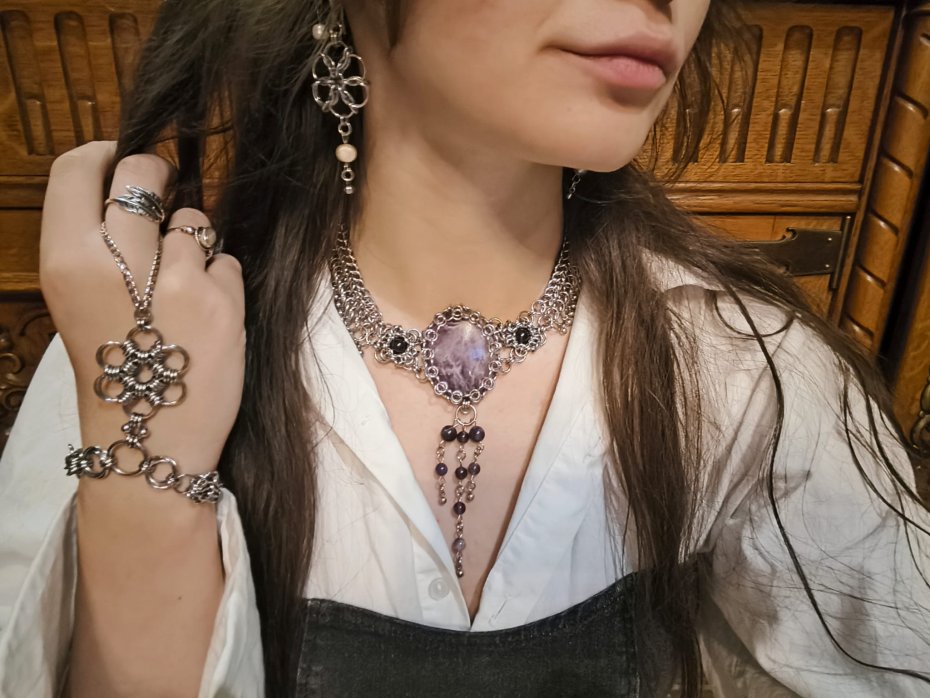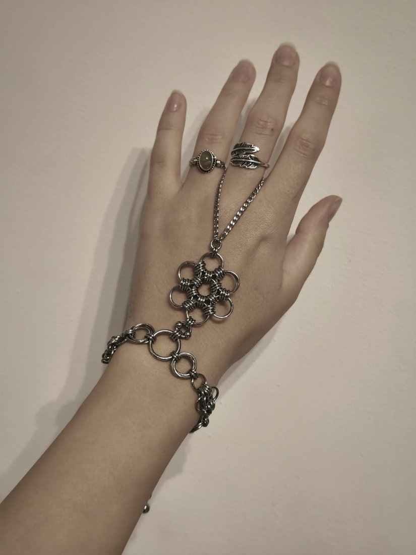 Długość łańcuszka od pierścionka do bransoletki: 12 cm – pięknie opada od najwyższego punktu pierścionka aż do chainmaille na nadgarstku
