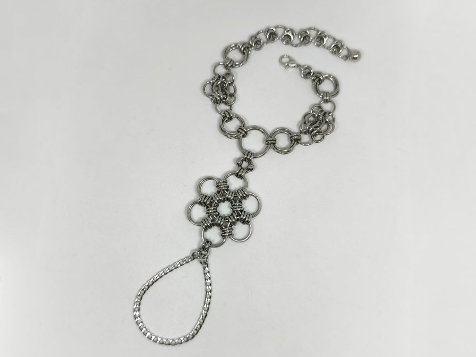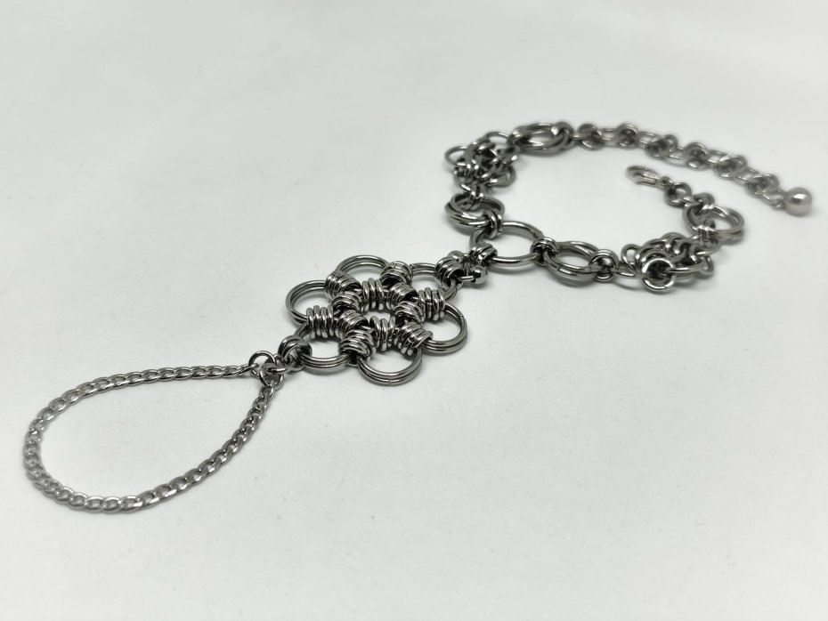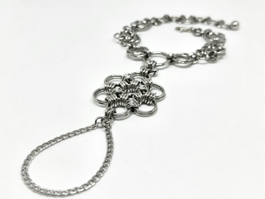 Ręcznie tkana z setek ogniwek stali chirurgicznej 316L + cienki łańcuszek i dwie stalowe kulki. Połączenie bransoletki i pierścionka – wygląda jak elfia zbroja na ręce.
