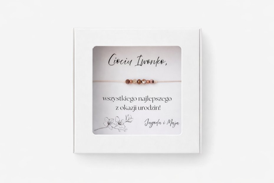 Delikatna, minimalistyczna bransoletka na sznureczku z wyselekcjonowanymi koralikami to wyjątkowy sposób, by przekazać najważniejsze emocje. Każda sztuka umieszczona jest w eleganckim pudełku z okienkiem oraz kartą z dedykacją – gotowa do wręczenia bez dodatkowego pakowania.