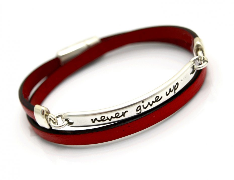Wygodna, podwójnie oplatająca nadgarstek bransoletka wykonana z płaskiego, skórzanego rzemienia w kolorze czerwonym (o szerokości 0,5cm). Bransoletka ozdobiona cynowym łącznikiem z napisem "never give up" (o wymiarach 5x43x2mm). Zapięcie wykonane jest z cyny i ma wbudowany magnes.
