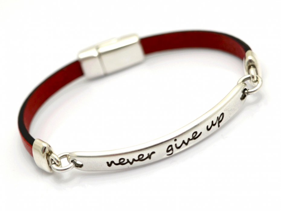 Wygodna bransoletka, wykonana z płaskiego, skórzanego rzemienia w kolorze czerwonym (o szerokości 0,5cm) z cynowym łącznikiem z napisem "never give up" (o wymiarach 5x43x2mm). Zapięcie wykonane jest z cyny i ma wbudowany magnes.