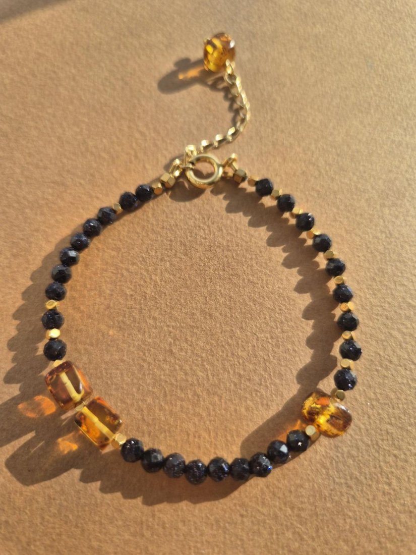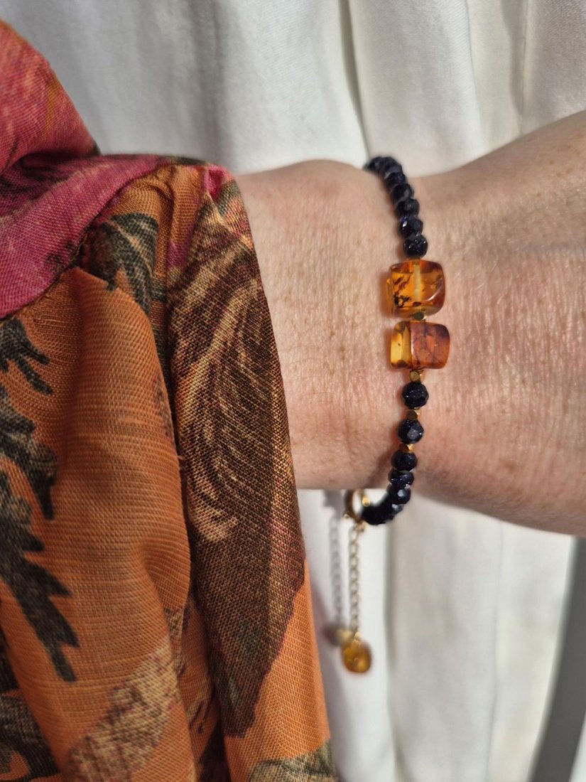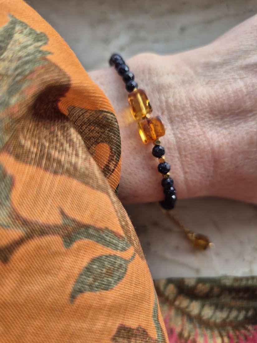 Bransoletka wykonana ręcznie z kamieni Noc Kairu, bursztynu i złotych hematytów. Subtelna, ale wyrazista – pięknie pracuje ze światłem i zmienia się w zależności od kąta patrzenia. Uzupełniona o małą zawieszkę z bursztynu i delikatny łańcuszek z pozłacanego srebra 925, które dodają jej lekkości i swobodnego, nieco artystycznego charakteru.