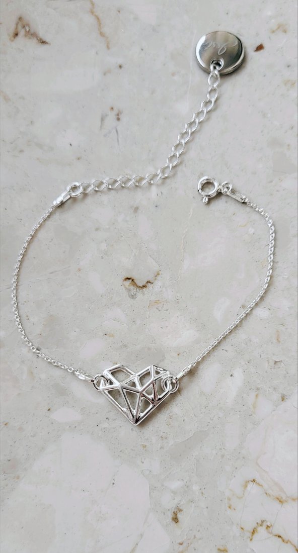 Bransoletka wykonana ze srebra najwyższej próby 925, z zawieszką w kształcie geometrycznego serduszka.