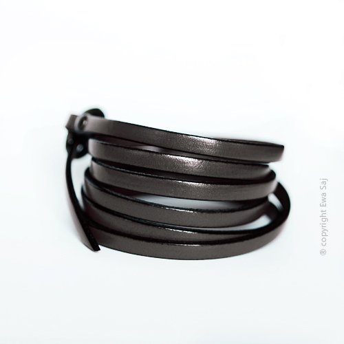 Prosta bransoletka skórzana w kolorze szarym, rzemyk o szerokości 5 mm - sześciokrotnie owija nadgarstek - zapięcie umozliwiajace regulację długości wykonane z metalu w kolorze antycznego złota. Zapięcie sygnowane autorskim podpisem. Pasek pasuje do wszystkich rodzajów zegarków z mojej kolekcji. Wolny od niklu i ołowiu - antyalergiczny. copyright Ewa Saj. All Rights Reserved.