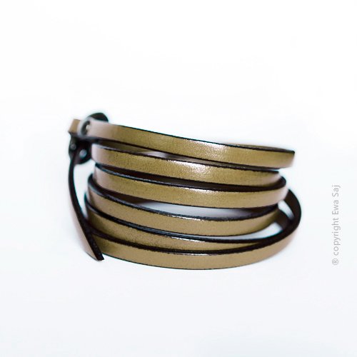 Prosta bransoletka skórzana w kolorze beżowo-oliwkowym, rzemyk o szerokości 5 mm - sześciokrotnie owija nadgarstek - zapięcie umozliwiajace regulację długości wykonane z metalu w kolorze antycznego srebra. Zapięcie sygnowane autorskim podpisem. Pasek pasuje do wszystkich rodzajów zegarków z mojej kolekcji. Wolny od niklu i ołowiu - antyalergiczny. copyright Ewa Saj. All Rights Reserved.