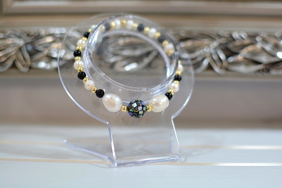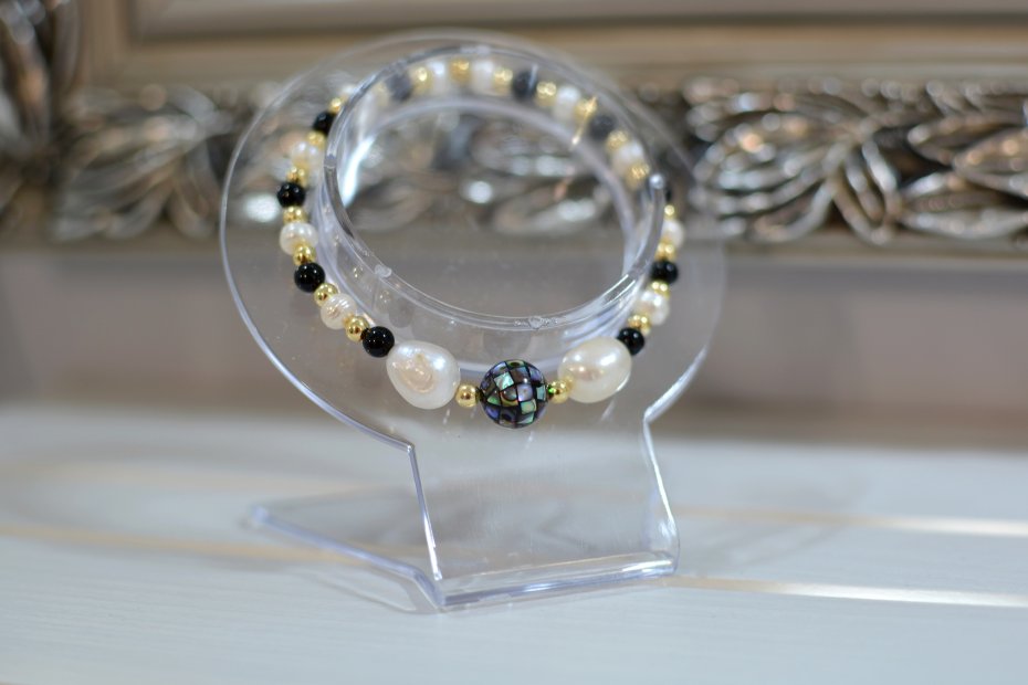Elegancka bransoletka na gumce wykonana z perełek słodkowodnych (5x6mm), kulek onyksu (śr. 4mm), kuleczek platerowanego na kolor złoty hematytu (śr. 3mm), a także kuleczek ze stali szlachetnej w kolorze złotym. W jej centralnym punkcie znajduje się kulka, która jest zdobiona przez nieregularne fragmenty muszli paua a jej powierzchnia dodatkowo zabezpieczona jest przezroczystą żywicą, która pięknie uwydatnia opalizowanie muszli. Z centralną, migoczacą na różne kolory mozaikową kulą o śr.10mm sasiadują dwie większych rozmiarów perły słodkowodne (długości ok. 11-12mm).