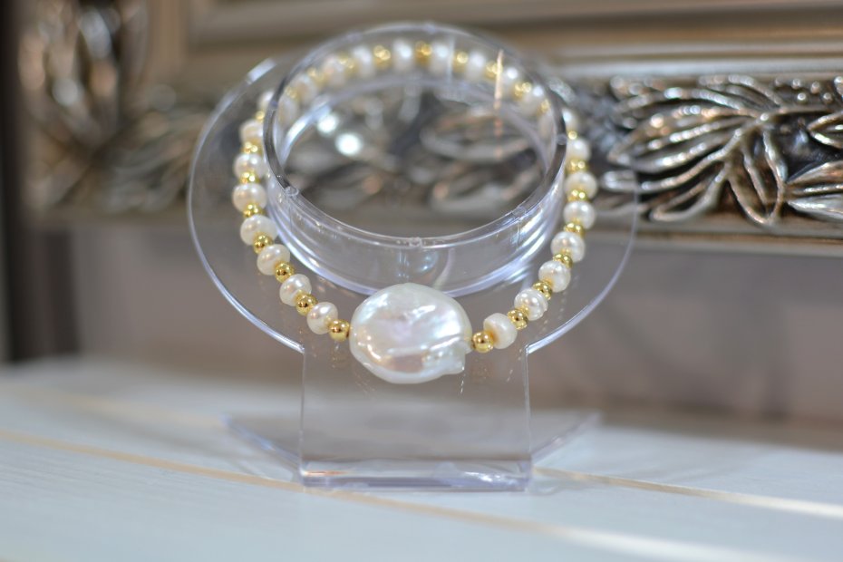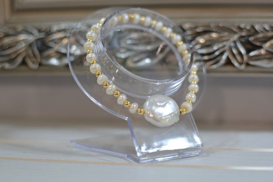 Elegancka bransoletka na gumce wykonana z perełek słodkowodnych (5x6mm) oraz kuleczek platerowanego na kolor złoty hematytu (śr. 3mm), a także kuleczek ze stali szlachetnej w kolorze złotym. W jej centralnym punkcie znajduje się perełka keshi o nieregularnym kształcie i wymiarach ok. 17x19mm.