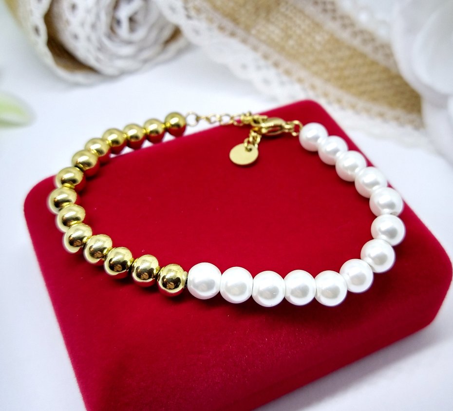 B2553 Elegancka bransoletka z perełek i złotych kul.