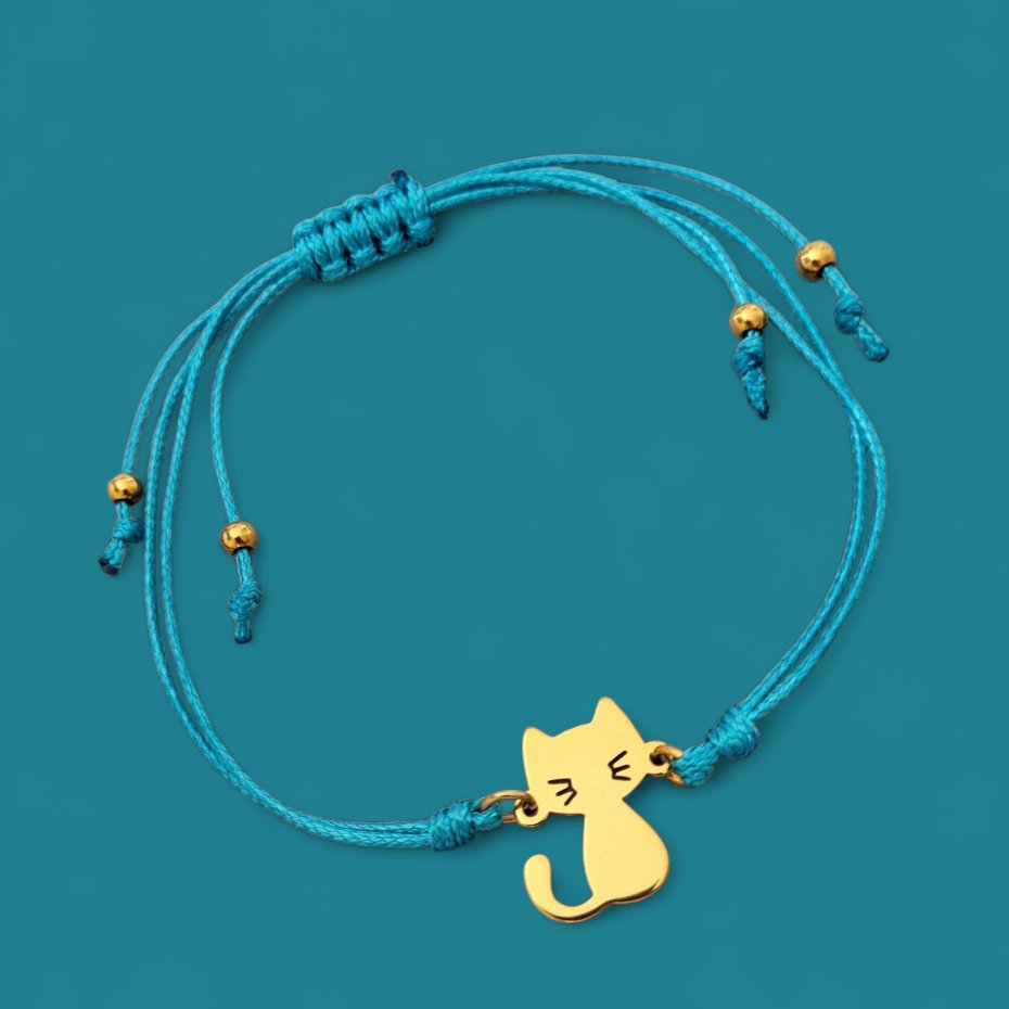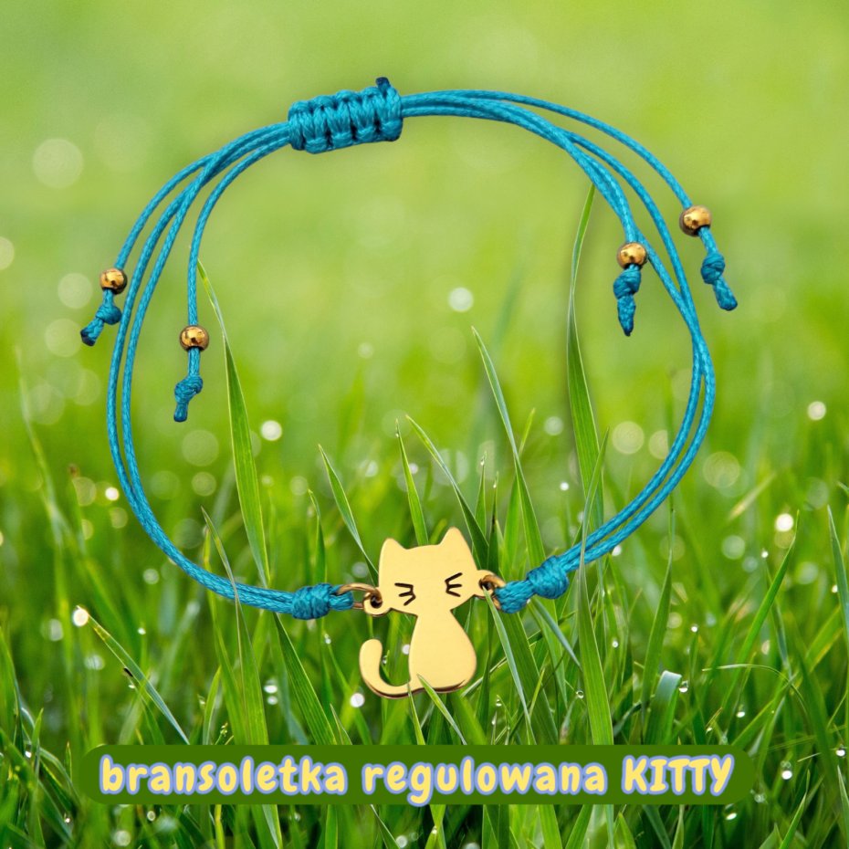 Delikatna bransoletka wykonana na bazie sznureczków woskowanych w kolorze morskim, z łącznikiem ze stali szlachetnej w kształcie kotka (18x15mm) w kolorze złotym.