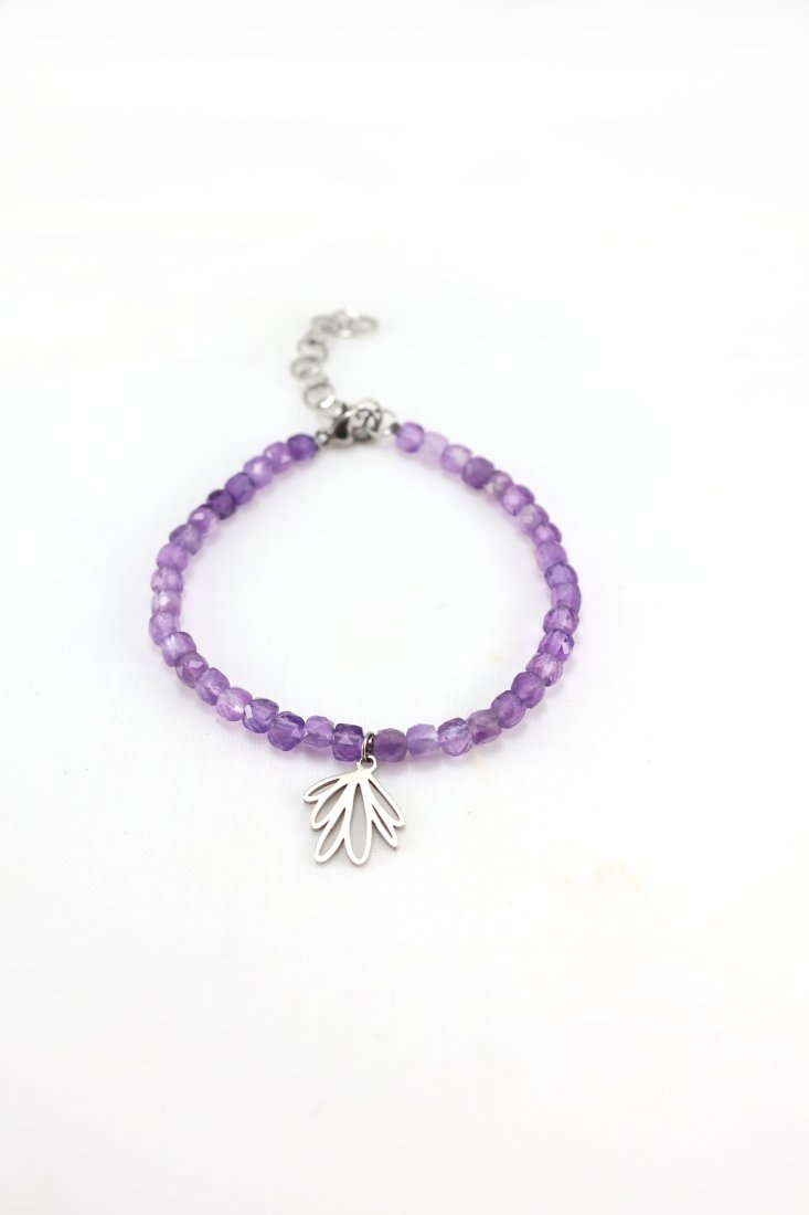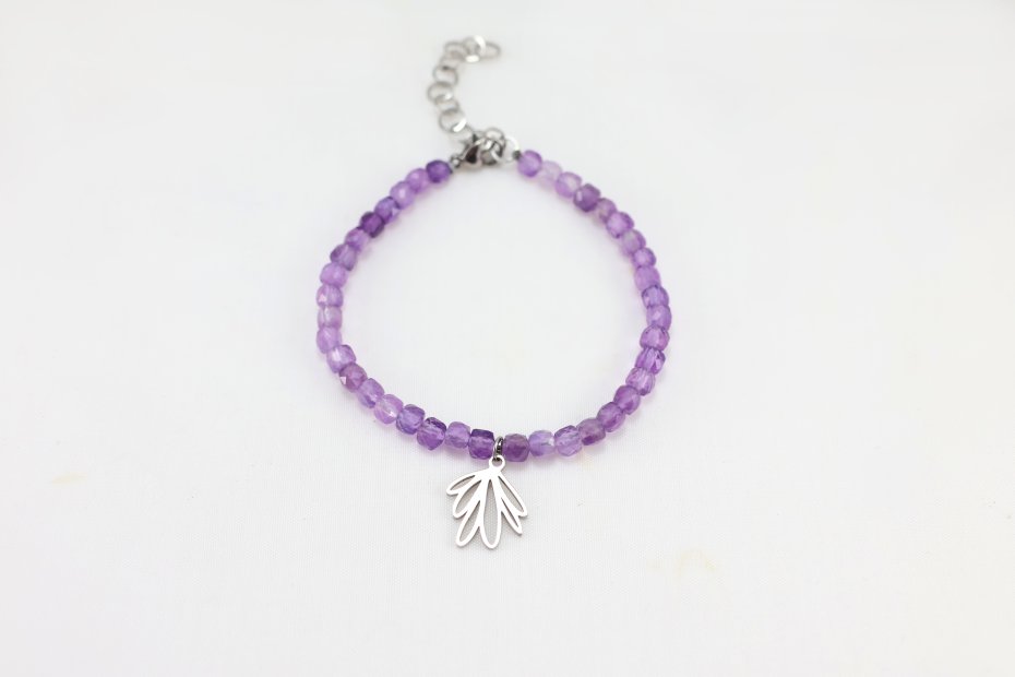 Noszenie fioletu symbolizuje intuicję, mądrość i duchową ochronę. Kwadratowe koraliki łapią światło z każdym ruchem nadgarstka, dając efekt dyskretnego luksusu. Ametyst jest znany jako kamień czystości i silnej aury. Wierzy się, że: Chroni przed stresem i negatywnymi energiami, wspomaga spokojny sen i medytację, wzmacnia kreatywność i koncentrację. Elegancki srebrny listek dodaje nowoczesnego szyku i symbolizuje odnowę. Regulowane zapięcie w kolorze srebra pozwala na idealne dopasowanie, a duże oczka w łańcuszku przedłużającym ułatwiają samodzielne zakładanie bransoletki.