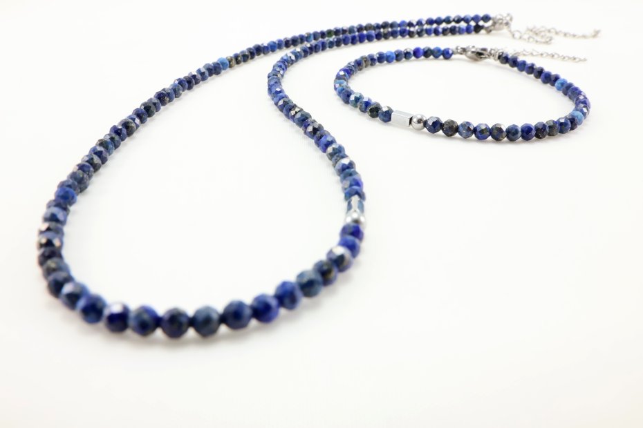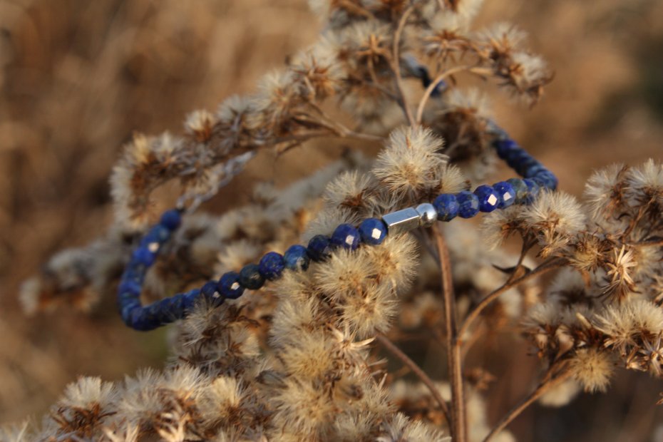 Bransoletka z naturalnych kamieni lapis lazuli z intrygującymi elementami kuli i prostopadłościanu wykonanymi ze srebrnego hematytu. Bransoletka poosiada możliwość przedłużenia dzięki czemu można ją indywidualnie dopasować.