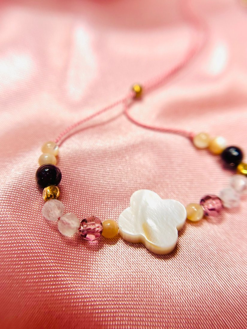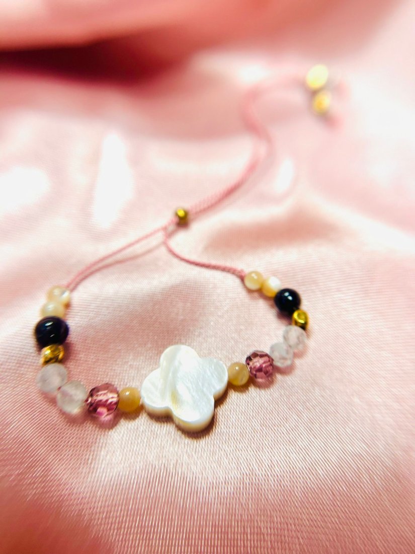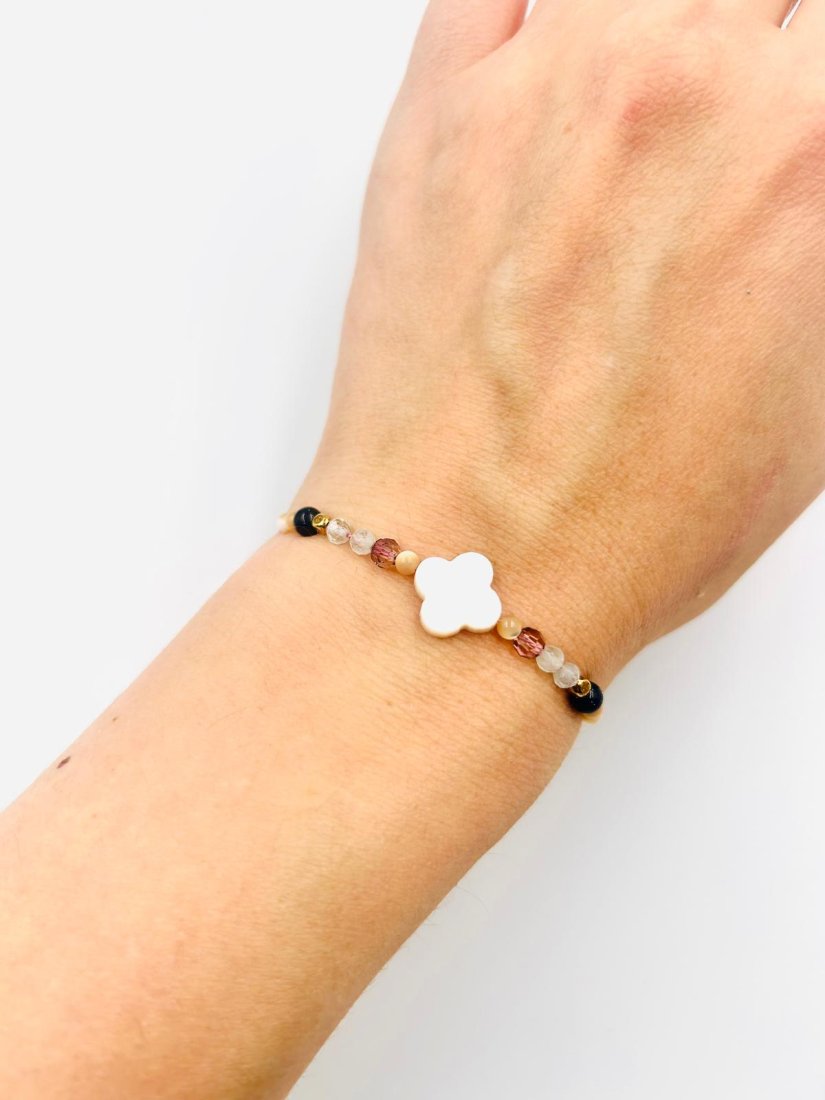 Bransoletka z koniczynką z masy perłowej :) Naturalnych kamieni: kryształ górski i Noc Kairu :)