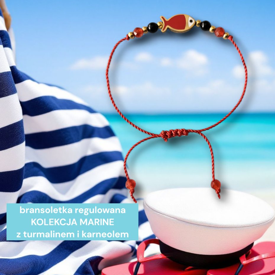 Delikatna bransoletka wykonana z emaliowanej przekładki ze stali szlachetnej w kształcie rybki (14x7mm), a także fasetowanych kulek karneolu oraz kulek turmalinu nanizanych na mocną nitkę jubilerską w kolorze czerwonym.