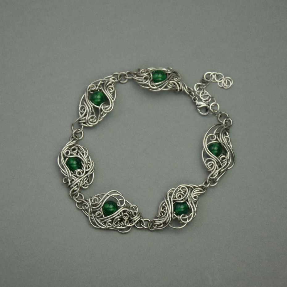 Ręcznie robiona bransoletka z zielonym onyksem. Wykonana techniką wire wrapping z drutów ze stali chirurgicznej.