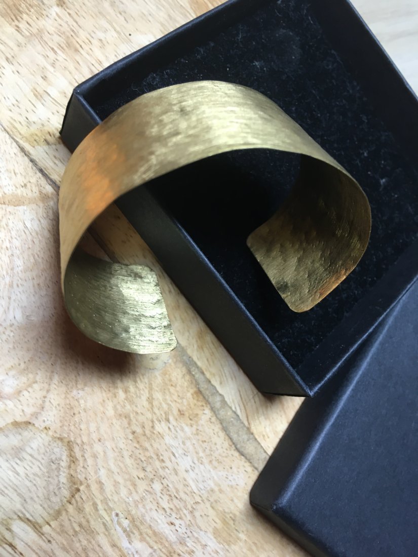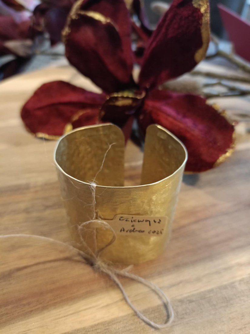 Szerokość 5 cm, wykonana z mosiądzu , niezwykle miękka i lekka . Zostanie zapakowana na prezent . Polecam