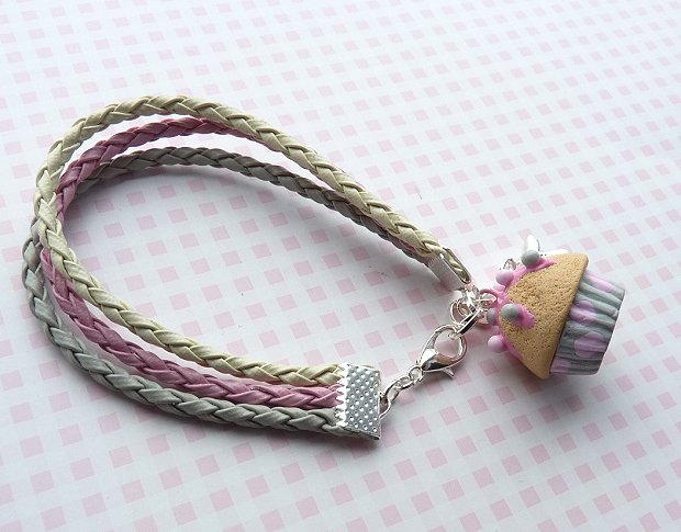 Oryginalna i słodka bransoletka z rzemyków plecionych, z babeczką z polewą i posypką:) długość bransoletki regulowana, ok.16cm+łańcuszek przedłużający, wysokość zawieszki: ok.2,5cm. Wysyłam ozdobnie zapakowaną;)
