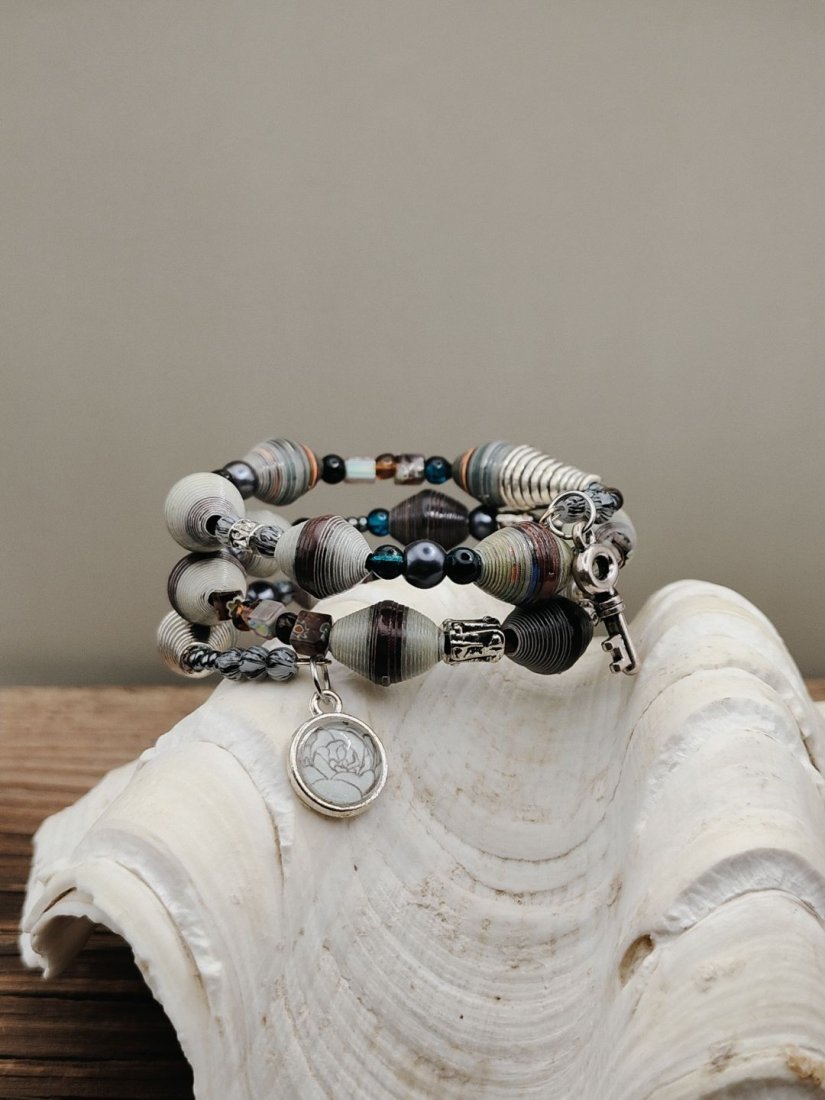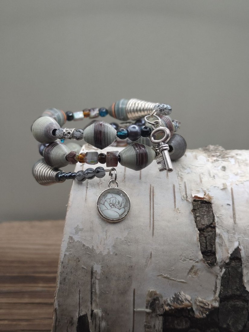 Unikatowa bransoletka handmade, która łączy rzemiosło artystyczne z ideą slow fashion. Wykonana z ręcznie zwijanych i lakierowanych koralików papierowych, zachwyca swoją formą, lekkością i niepowtarzalnym charakterem. Stonowana kolorystyka ziemi – odcienie szarości, beżu, grafitu i subtelnych akcentów niebieskiego – nadaje jej elegancki, naturalny wygląd. Całość uzupełniają dekoracyjne elementy i symboliczne zawieszki, które dodają bransoletce wyjątkowej historii i charakteru. To biżuteria dla osób ceniących oryginalność, ekologię i rękodzieło z duszą.