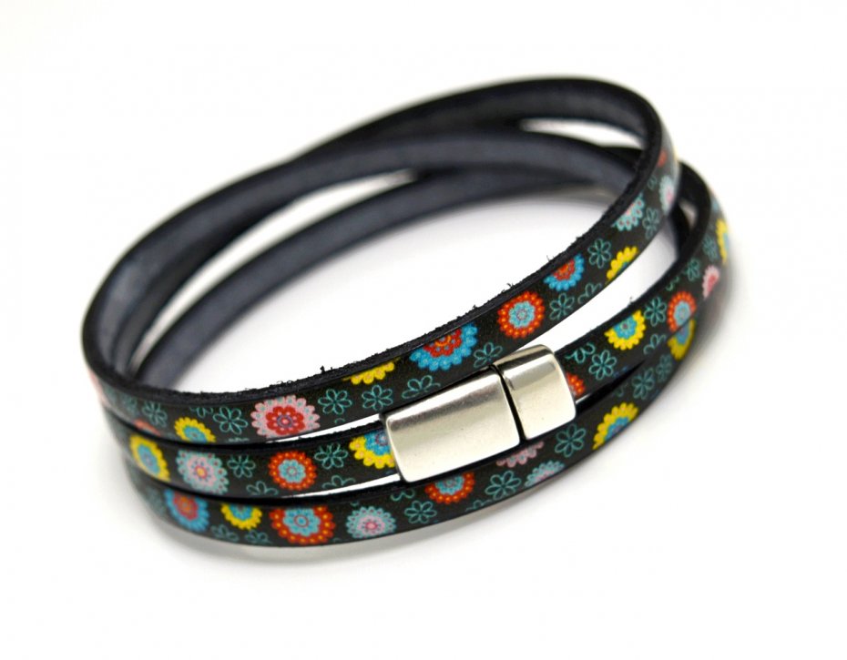 Wygodna bransoletka wykonana z wzorzystego, płaskiego rzemienia skórzanego (o szerokości 0,5cm) z cynowym zapięciem (z wbudowanym magnesem) w kolorze srebrnym.