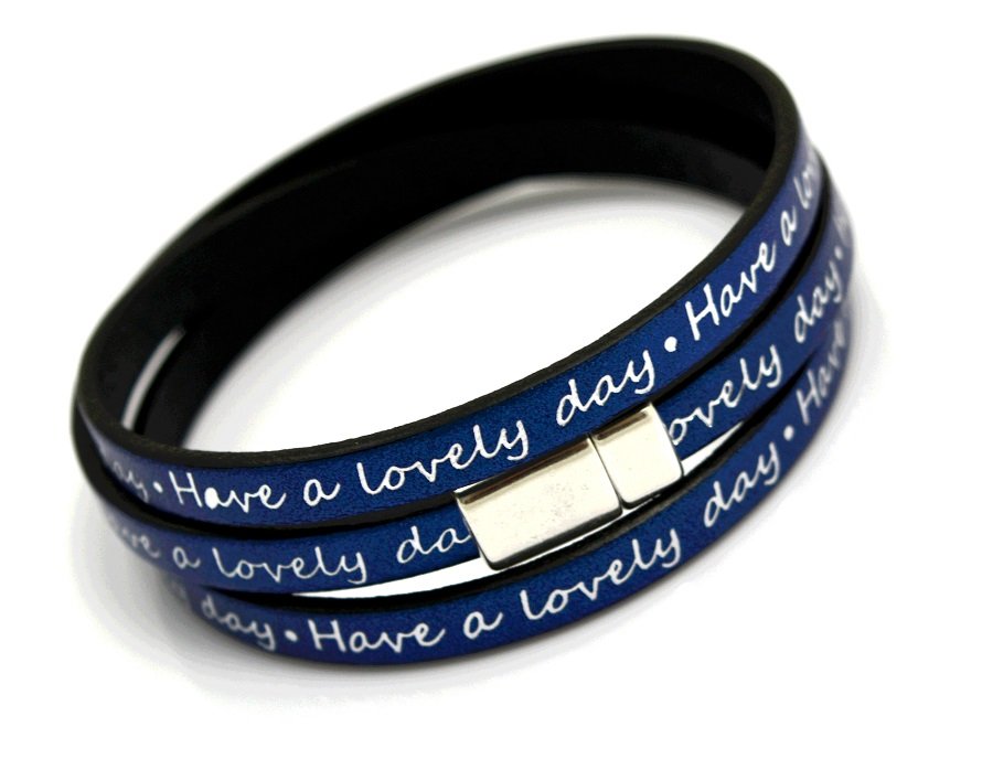 Wygodna bransoletka wykonana ze skórzanego, płaskiego (o szerokości 0,6cm) rzemienia w kolorze montana perłowa z srebrnymi napisami “Have a lovely day" oraz z cynowym zapięciem z wbudowanym magnesem.