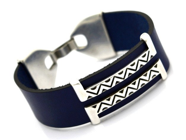 Efektowna bransoletka wykonana z wysokiej jakości skórzanego rzemienia w kolorze granatowym o szerokości 2cm z elementem ozdobnym z cyny (wielkość elementu to ok. 4x2,2cm).