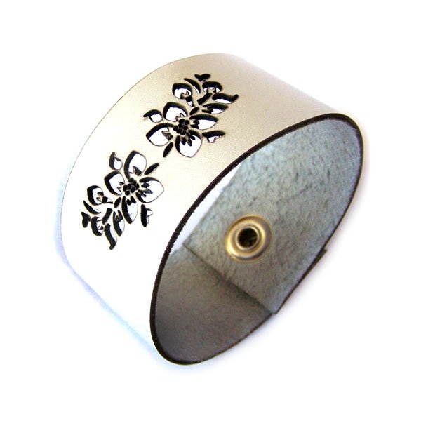 Bransoletka wycięta w skórze naturalnej .Grubość ok 1,2mm. Ażurowy wzór mojego projektu. Bransoletka wycięta laserowo. Długość bransoletki 20cm, szerokość 3cm. Po zapięciu obwód ma 18cm. Kolor jak na zdjęciu - czysta biel. Zapięcie - duże napy.