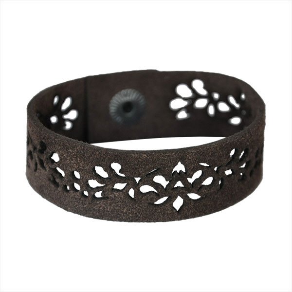 Bransoletka wycięta w skórze naturalnej - zamsz .Grubość ok 1,2mm. Ludowy, ażurowy wzór mojego projektu. Bransoletka wycięta laserowo. Długość bransoletki 20cm, szerokość 2cm. Po zapięciu obwód ma 18cm. Kolor jak na zdjęciu - brązowy. Zapięcie - nap. Możliwość zamówienia innego rozmiaru proszę pisać. Na ostatnim zdjęciu porównanie z inną bransoletką.