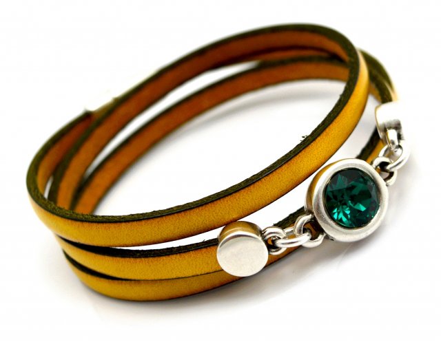 Wygodna bransoletka wykonana ze skórzanego płaskiego rzemienia w kolorze miodowożółtym o szerokości 0,5cm z ozdobnym cynowym zapięciem z wbudowanym magnesem.