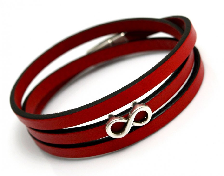 Wygodna bransoletka wykonana ze skórzanego płaskiego rzemienia w kolorze czerwonym (o szerokości 0,5cm) z cynowym zapięciem z wbudowanym magnesem.