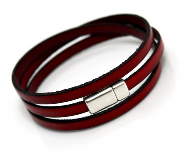Wygodna bransoletka wykonana ze skórzanego, płaskiego rzemienia w kolorze wina (o szerokości 0,5cm) z cynowym zapięciem z wbudowanym magnesem.