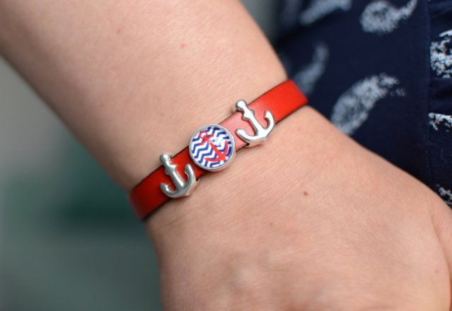 Wygodna bransoletka wykonana z płaskiego rzemienia skórzanego (o szer. 1cm) w kolorze czerwonym, ozdobiona kaboszonem z grafiką z motywem kotwicy i dwiema przekładkami w kształcie kotwicy.