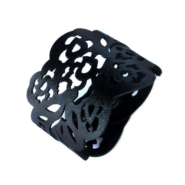 Bransoletka ze skóry naturalnej. Drobny, ażurowy wzór kwiatowy mojego projektu. Długość bransoletki 18,5cm, szerokość 5cm. Po zapięciu obwód ma 16,5cm