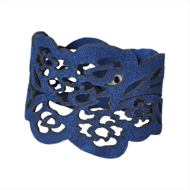 Bransoletka z zamszu naturalnego. Drobny, ażurowy wzór kwiatowy mojego projektu. Długość bransoletki 20cm, szerokość 5cm. Po zapięciu obwód ma 18cm. Możliwość zamówienia innego wymiaru, proszę o wcześniejszy kontakt. Na ostatnim zdjęciu porównanie wielkości z innymi bransoletkami.