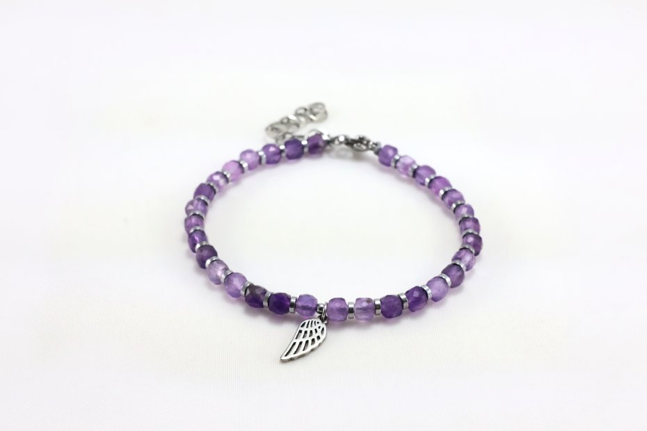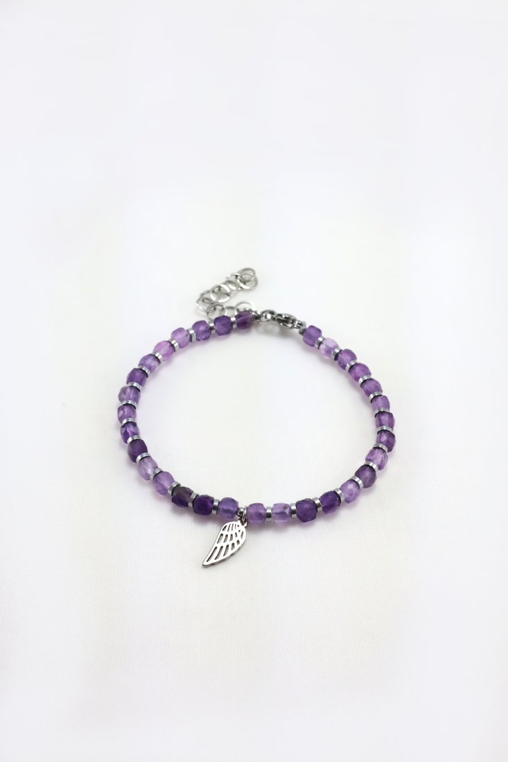Bransoletka Skrzydło Anioła wykonana jest z ametystów w kształcie kostki. To połączenie naturalnego piękna z głęboką symboliką spokoju i opieki. Delikatne, fasetowane kamienie pięknie łapią światło. Subtelna zawieszka dodaje uroku i osobistego znaczenia. Idealna do noszenia solo lub jako element większej kolekcji.