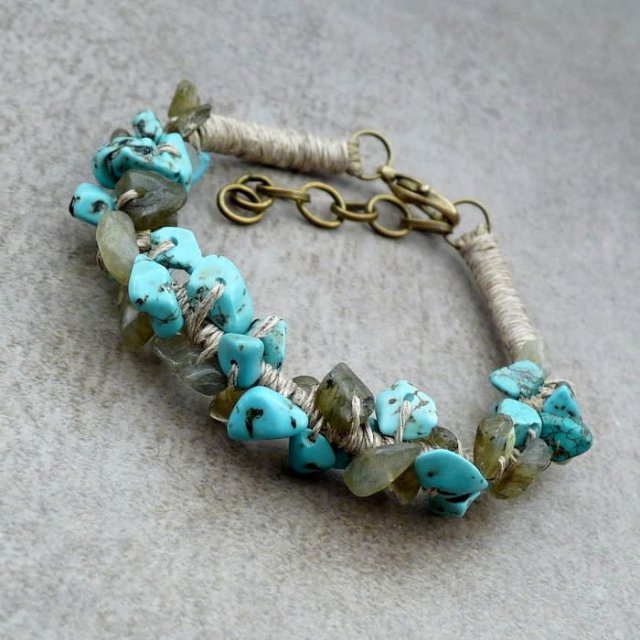 lekka, naturalna bransoletka wykonana na bazie naturalnej przędzy lnianej z oplecionymi wokół drobnymi kamieniami labradorytu i howlitu turkusowego. długość regulowana łańcuszkiem 19-22 cm. zapięcie i łańcuszek wykonane z mosiądzu