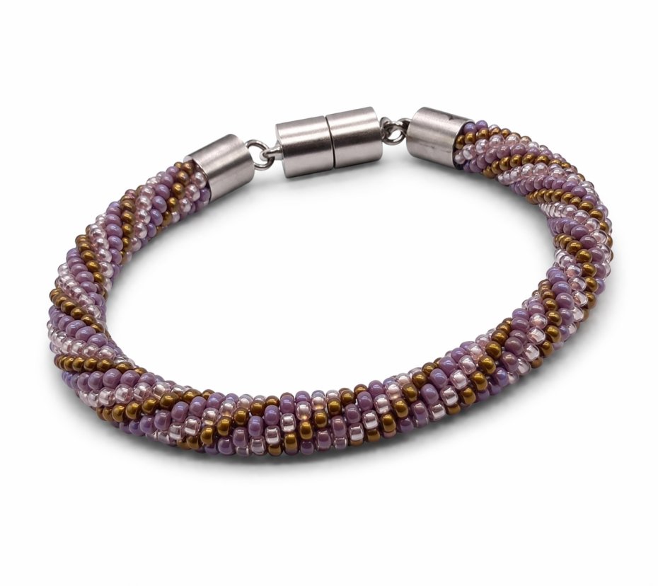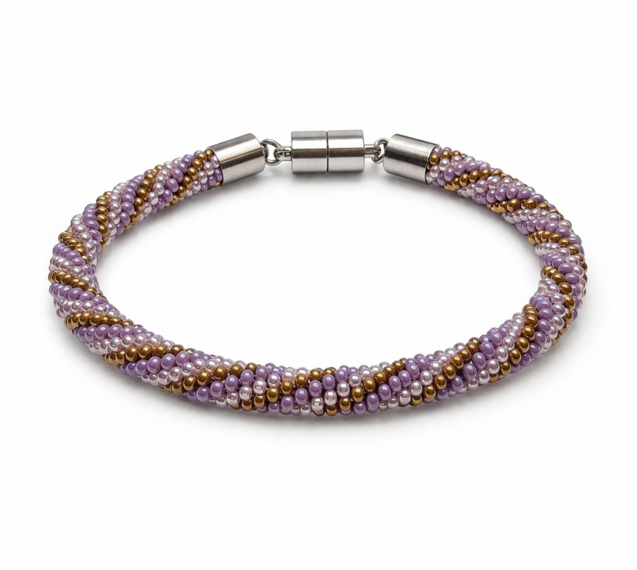 Dodaj swojej stylizacji subtelnej elegancji z ręcznie wykonaną bransoletką typu sznur koralikowy. Model ten wyróżnia się unikalnym, spiralnym splotem, który łączy w sobie odcienie stonowanego fioletu, pudrowego różu oraz połyskującego złota. Dzięki precyzyjnemu rozmieszczeniu drobnych koralików, biżuteria pięknie odbija światło i układa się na nadgarstku.