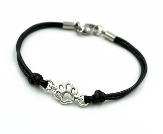 Bransoletka na bazie czarnego, woskowanego sznurka z cynowym łącznikiem - łapka (o wymiarach 17x11mm). Bransoletka została wykończona elementami ze stali szlachetnej, a zapinana jest na karabińczyk.